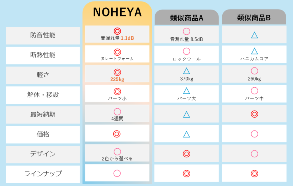 NOHEYAの壁面は全て日軽パネルシステムのジェネスタシリーズを使用。環境にも優しいノンフロン断熱不燃パネル。